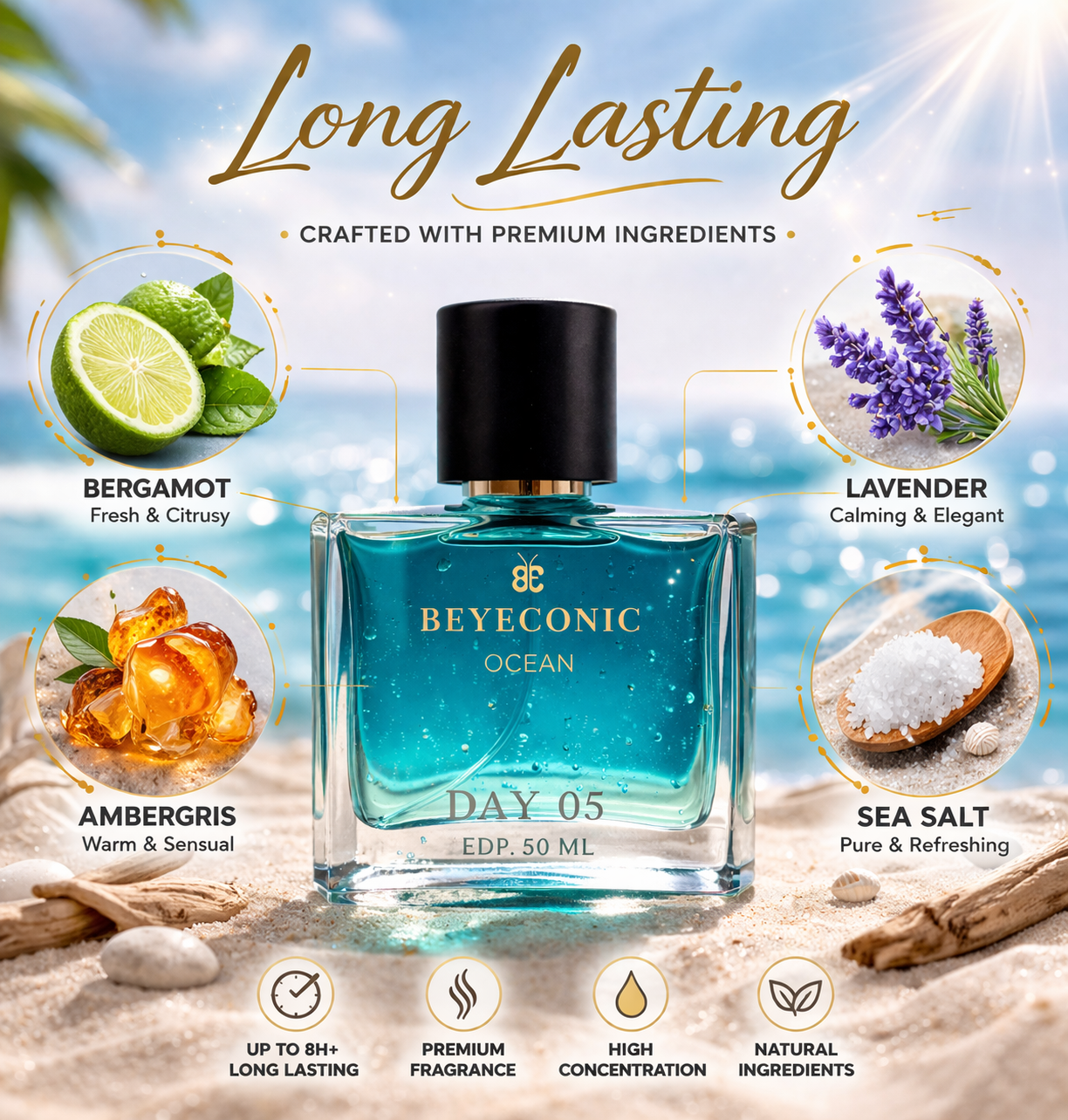 Ocean feels like fresh air with a premium finish. It starts bright, crisp, and refreshing, then settles into a clean aromatic heart that stays smooth and universally likeable. The base remains soft, musky, and modern, making it the perfect everyday scent that always feels right.